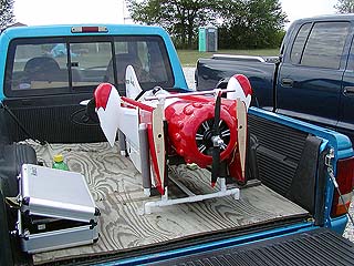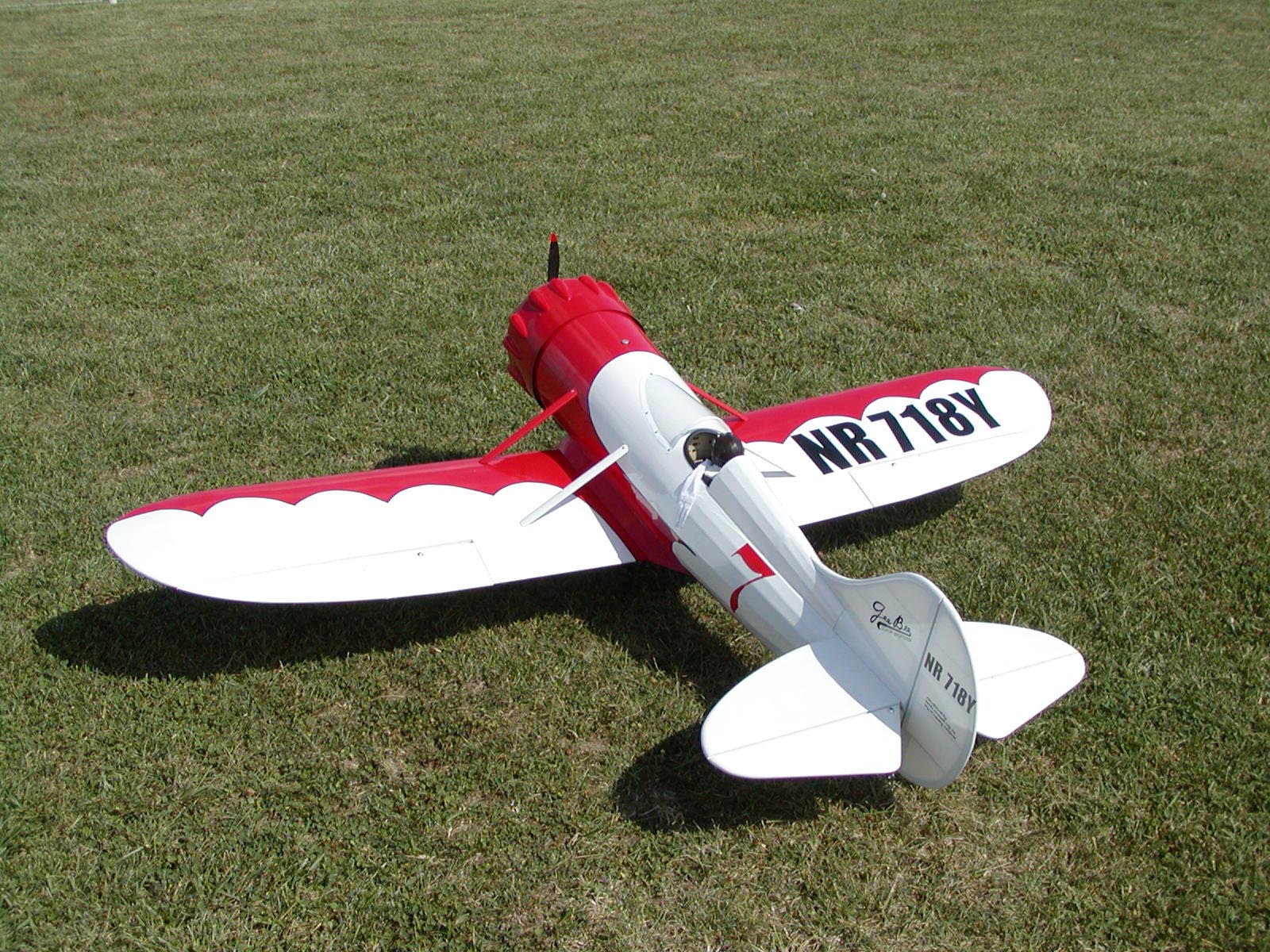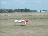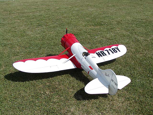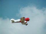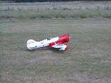First flight of my Gee Bee Y occurred on August 16, 2002. Very warm day (90F) with a 10-15mph wind from the south, directly down the runway. Everything went very well! The RCS140 seems happy, though still needs a bit of carb adjustment.