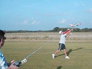 08/22/2004 - Launch of First Flight! Jeff Paul was my official launcher, as he has done a great job on most of the 28 flights I have on my Corsair. Carl Johnson is the very capable test pilot... and I'm manning the camera. Launch occured at about 75% throttle, which works out to about 125 watts of power.