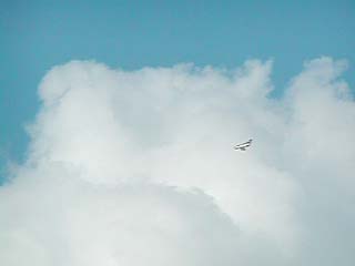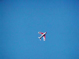 08/29/2004 - Third flight. First attempt at ROG (rise off grass) takeoff. The directions indicated it would take off by itself, so after skimming along the ground with no takeoff... I backed off the throttle. May try going ahead and giving it some up elevator after it gets up to speed. I'm on the transmitter and fellow member Jeff Paul is manning the camera.
