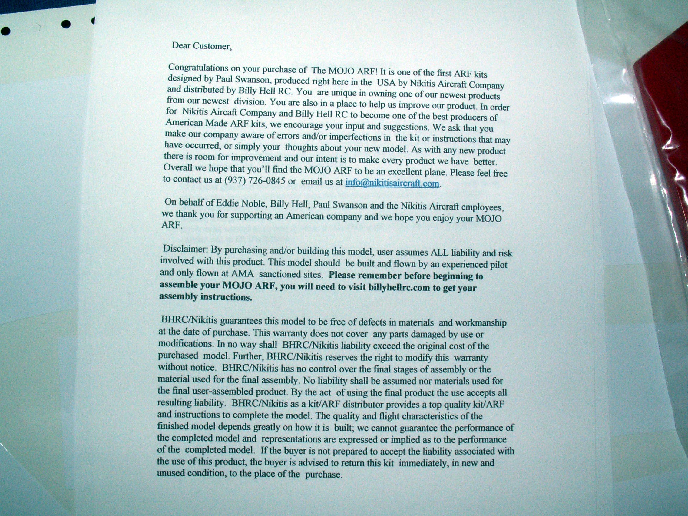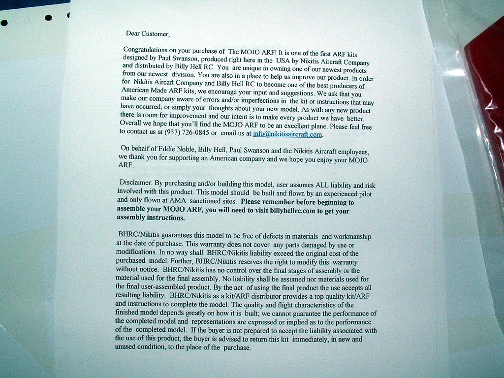 These are pictures and such of an MOJO 40 ARF, as it came out of the box.