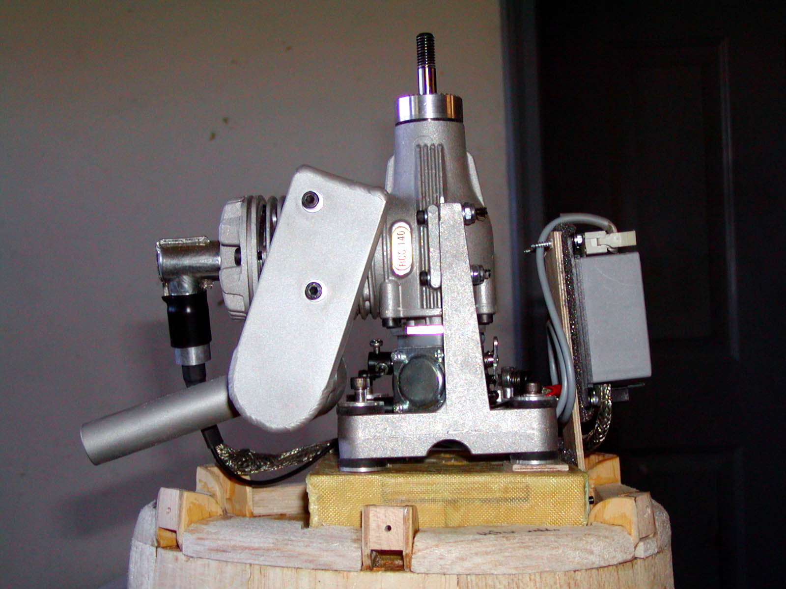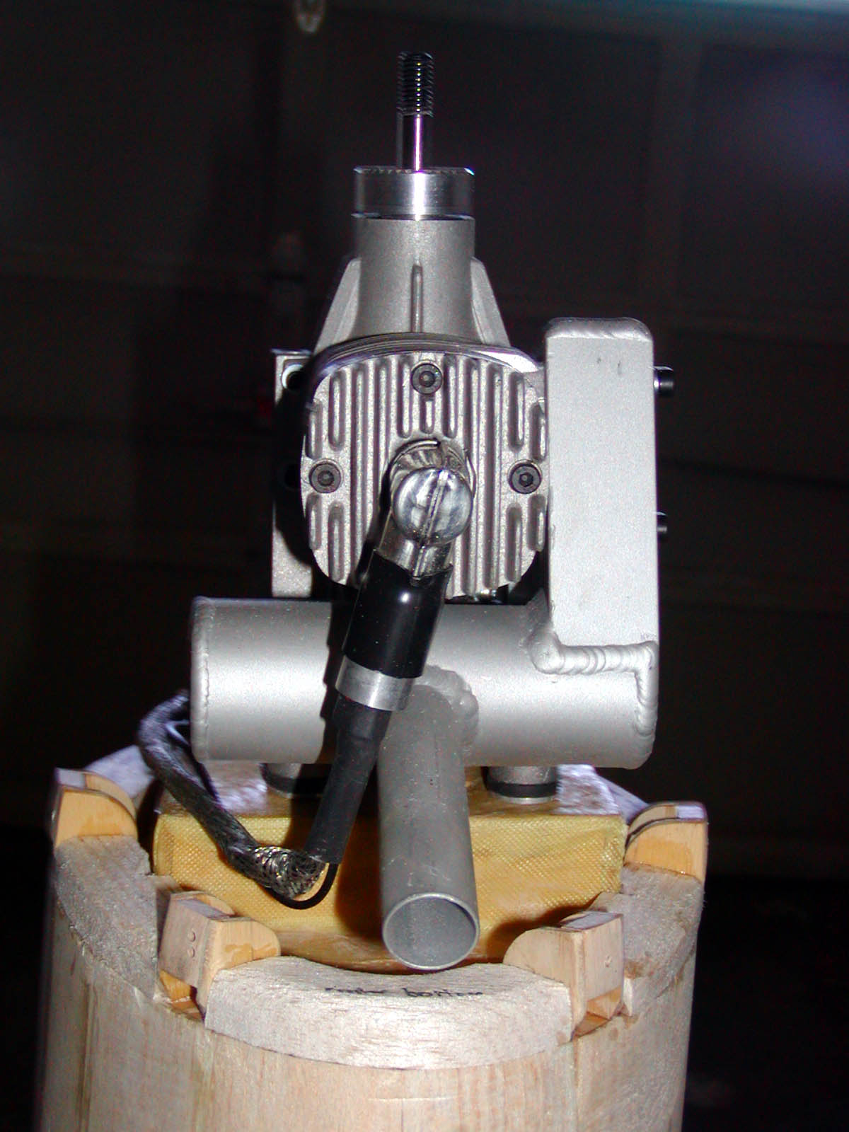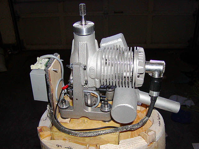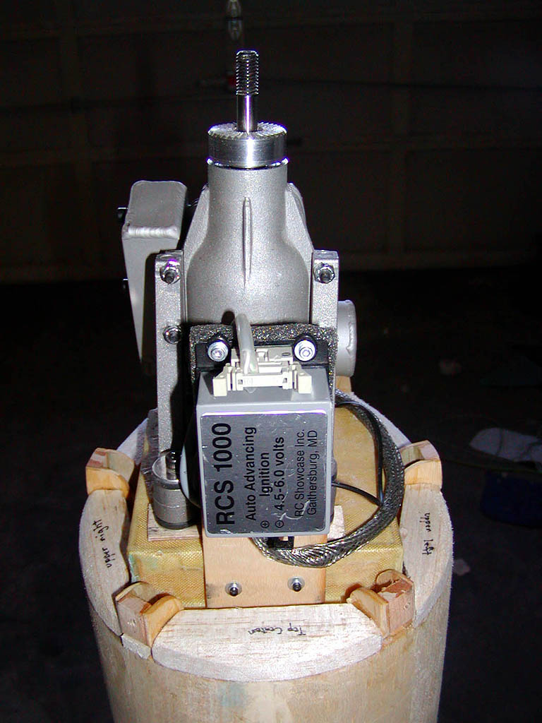 It is now October of 2001, five months after making the decision to purchase the P-47 from Randy. Engine is here and I can't wait to run it! It is a RCS-140 from R/C Showcase. This is a 1.4ci (22cc) gasoline engine, with electronic ignition and a high-quality pitts-style muffler. It has roughly the same power as a 1.20 4-stroke glow engine (swings that 16x8 APC around 9000rpm), which is the upper limit of Top Flite's recommended range, and is about the lightest-weight gasoline engine made for model airplanes. Should provide plenty of power, and fits the cowl pretty well (I may trim the exhaust pipe to only stick out a little... but probably not for the first flight or two).